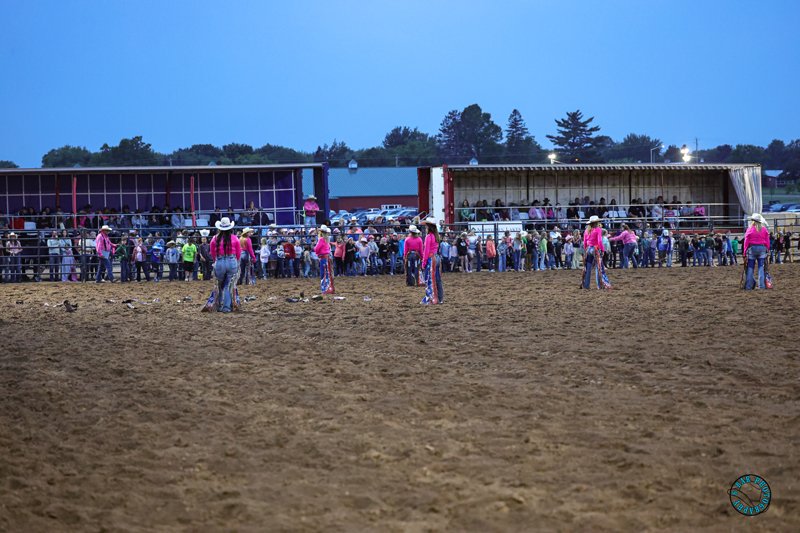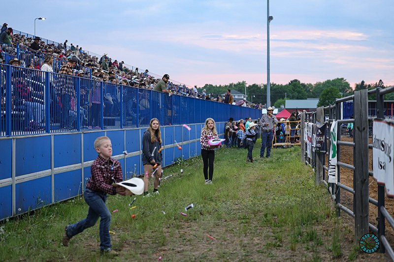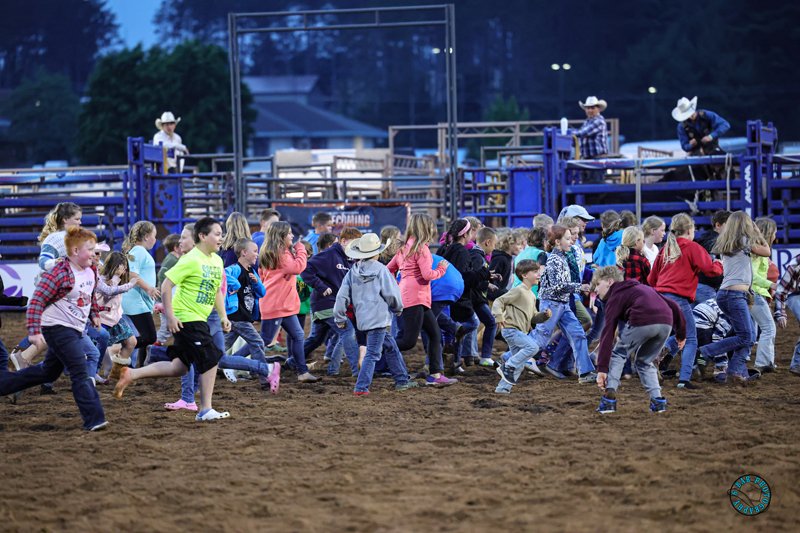 - Kids wanting to participate should listen to be called down and position themselves in the grass area between the grandstand and the arena.